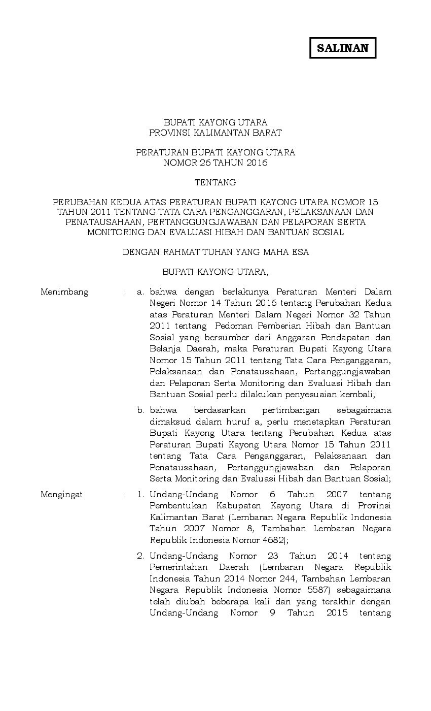 Peraturan Bupati Kayong Utara No 26 Tahun 2016 Tentang Perubahan Kedua Atas Peraturan Bupati Kayong Utara Nomor 15 Tahun 2011 Tentang Tata Cara Penganggaran Pelaksanaan Dan Penatausahaan Pertanggungjawaban Dan Pelaporan Serta Monitoring