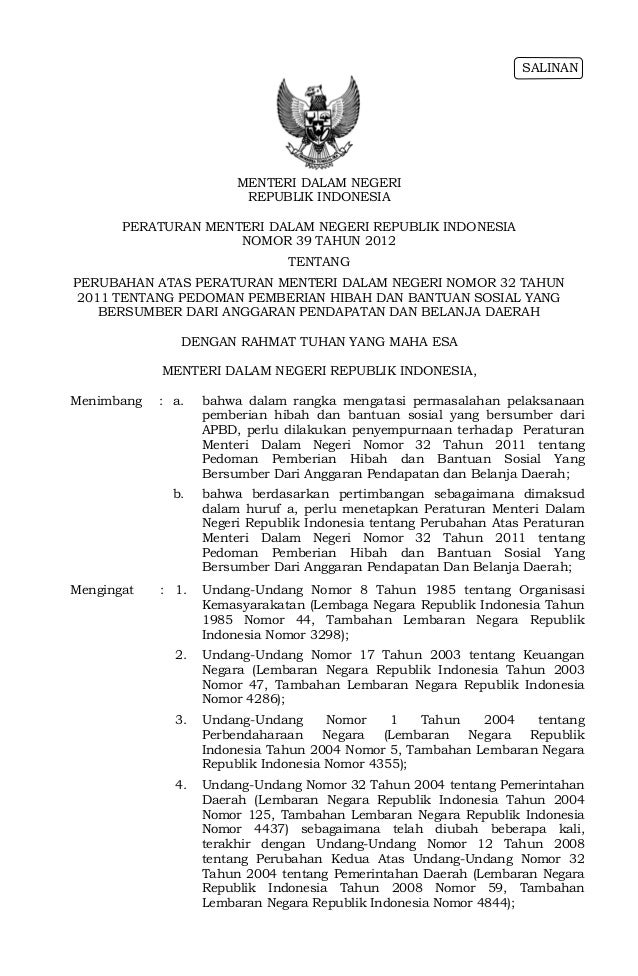 Permendagri 39 tahun 2012 tentang hibah dan bantuan sosial. Mei 2012 Mendagri kembali menetapkan Peraturan Menteri Dalam Negeri Nomor 39 Tahun 2012 tentang Perubahan Atas Peraturan Menteri Dalam Negeri Nomor 32 Tahun 2011 tentang Pedoman Pemberian Hibah dan Bantuan Sosial yang bersumber dari Anggaran Pendapatan dan Belanja Daerah Permendagri 392012. Nomor 39 tahun 2012 tentang perubahan atas peraturan menteri dalam negeri nomor 32 tahun 2011 tentang pedoman pemberian hibah dan bantuan sosial yang bersumber dari anggaran pendapatan dan belanja daerah dengan rahmat tuhan yang maha esa menteri dalam negeri republik indonesia menimbang. Permendagri 39 tahun 2012 perubahan atas peraturan menteri dalam negeri nomor 32 tahun 2011 tentang pedoman pemberian hibah dan bantuan sosial yang bersumber dari anggaran pendapatan dan belanja daerah.