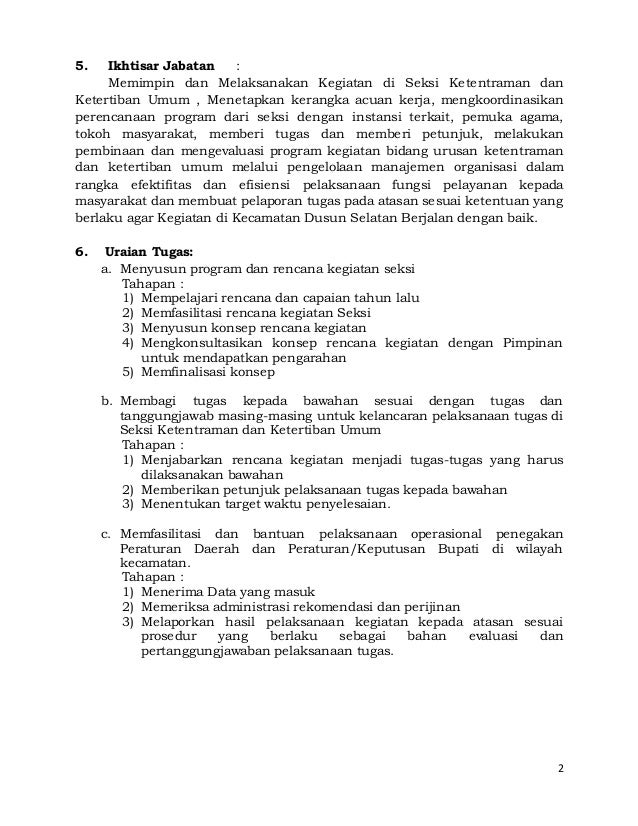 Uraian tugas pengevaluasi hasil kegiatan bantuan sosial. 2 Membuat perencanaan program tugas tugas pembatuan yang berasal dari bantuan dan sharing pusat provinsi dan sumbangan pihak pihak lain yang tidak mengikat dan sesuai peraturan perundang undangan. Berdasarkan tugas dan fungsi sebagaimana dimaksud pada ayat 1 dan ayat 2 Seksi Pemberdayaan Masyarakat dan Kesejahteraan Sosial mempunyai uraian tugas. Membagi tugas kepada Seksi di bawahnya sesuai dengan uraian tugas dan fungsi.
