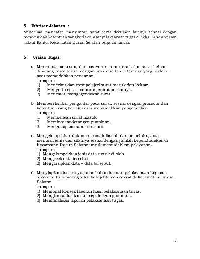 Menyiapkan surat keluar menyiapkan pengiriman surat keluar memilah surat masuk dan mendistribusikan surat masuk. URAIAN TUGASJABATAN JOB DESCRIPTION DAN PROFIL TUGASJABATAN JOB PROFILE. Mempelajari pedoman dan petunjuk pengumpulan dan pengolahan data serta informasi mengenai Monitoring Evaluasi dan Pelaporan untuk mengetahui macam dan formulir pengumpulan dan pengolahan data serta untuk pencatatan secara sistematis.