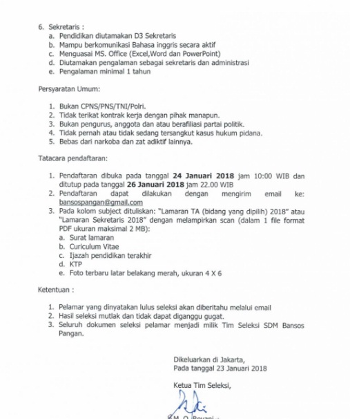 Ketua Panitia Seleksi. Bagi pelamar yang tidak memenuhi persyaratan agar tidak mengajukan lamaran. Home Diploma 3 Lowongan CPNS Sarjana S1 Segala Jurusan Sekretaris Teknik Pengumuman Penerimaan SDM Bantuan Sosial Pangan Kementerian Sosial Januari 2018 Wednesday January 24 2018.